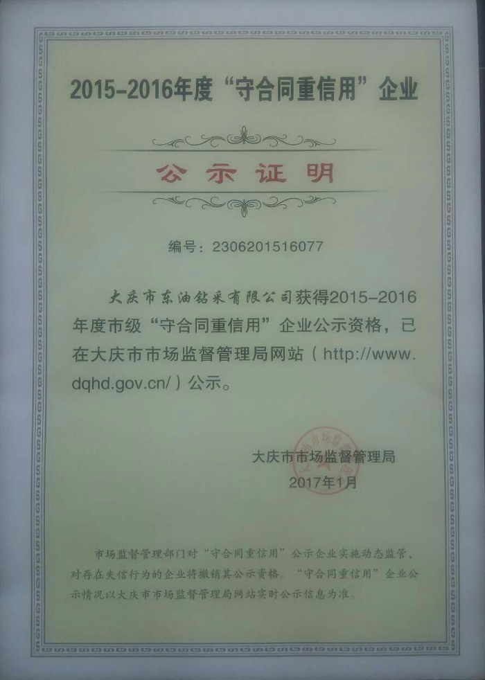 大慶市東油鉆采有限公司獲得2015-2016年度市級(jí)“守合同重信用”企業(yè)公示資格,已在大慶市市場監(jiān)督管理局網(wǎng)站公示。